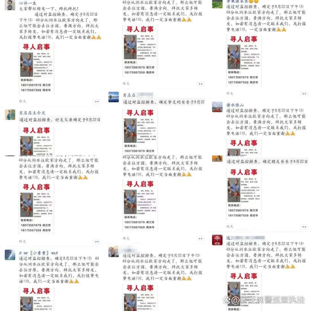 接警后,派出所一方面迅速出动警力赶至现场参与寻找,一方面紧急联系县局刑侦大队请求出动警犬寻人。与此同时,一则寻人消息也在朋友圈疯狂转发。